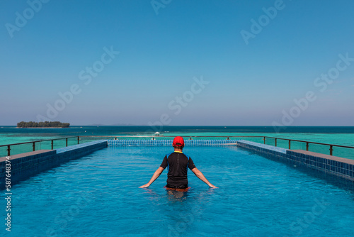 Fototapeta premium Man relaxing in the infinity pool hanging over turquoise lagoon of Karimunjava Indonesian tropical island.