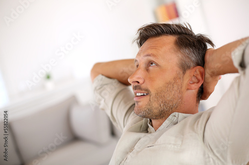 © goodluz, Obraz premium Man relaxing with outstretched arms behind head