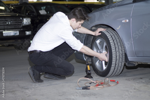 © Мария Манн, Fototapeta premium man repairing his car on the phone