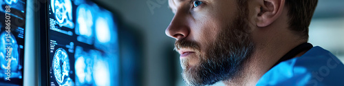© Lila Patel, Obraz premium Man Reviewing Brain Scans on Medical Monitor