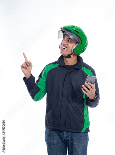 © Odua Images, Fototapeta premium man rider wear helmet pointing to blank copyspace