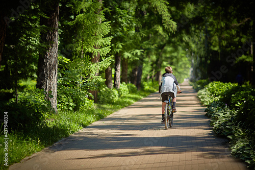 © Татьяна Кутина, Obraz premium Man rides a bicycle on a road in a green park on a sunny summer day.