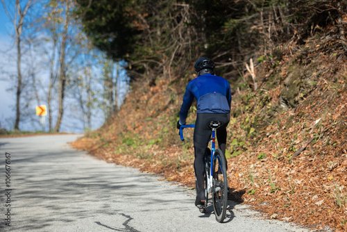 © Ivica Drusany, Obraz premium Man riding a bike on the road in the forest