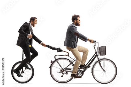Obraz premium Man riding a unicycle and holding an umbrella behind a man with a bicycle