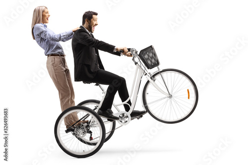 © Ljupco Smokovski, Obraz premium Man riding a woman on a tricycle with front wheel up