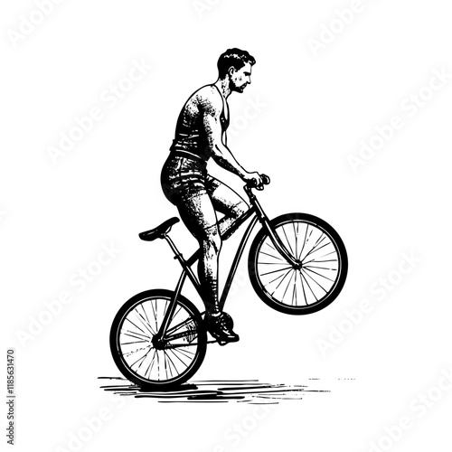 © ascrea, Obraz premium man riding bicycle sketch engraving black and white outline. Scratch board imitation.