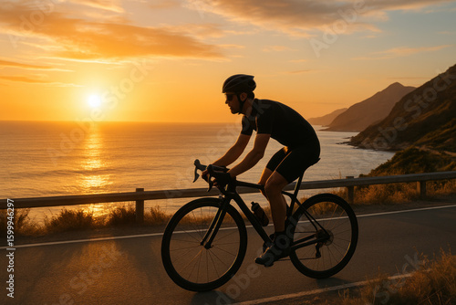 Fototapeta premium Man riding bike at sunset on road. Total characters: .