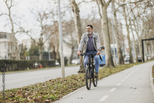 Fototapeta premium Man Riding Bike Down Bicycle Lane