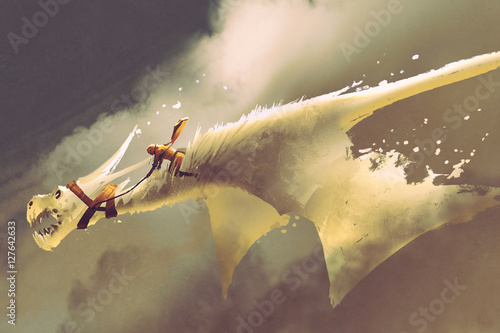 © grandfailure, Fototapeta premium man riding on the white flying dragon against a cloudy sky,illustration painting