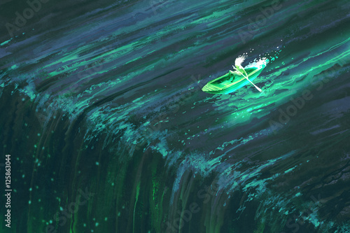 Obraz premium man rowing in glowing green boat near edge of waterfall,illustration painting