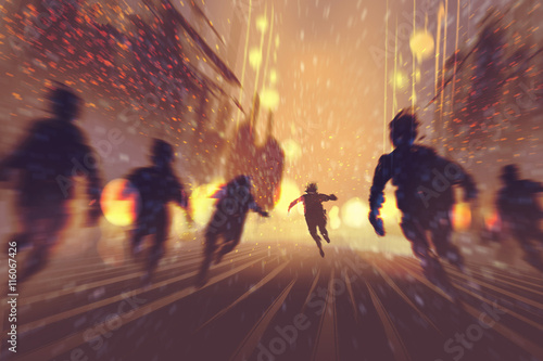 Obraz premium man runing away from zombies,burning city in background,illustration,digital...