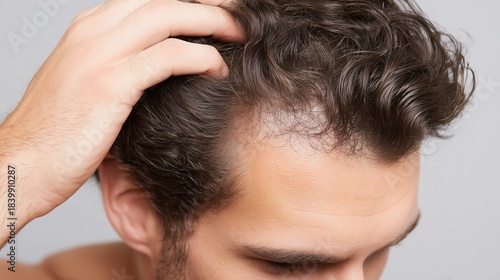 Fototapeta premium Man running hand through dark hair, examining thinning hair and scalp