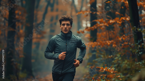 © anatoliycherkas, Obraz premium Man Running in Autumn Forest, Outdoor Exercise, Fitness Training in Nature