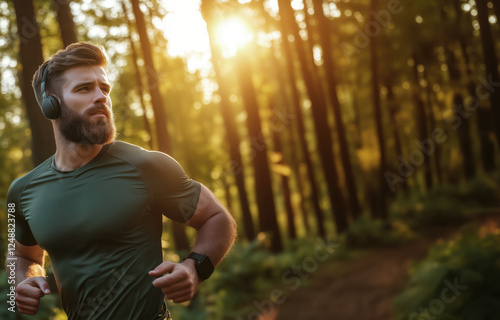 Obraz premium Man Running in Forest with Headphones at Sunrise Light