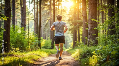 © thanakrit, Obraz premium Man Running Through Forest Trail at Sunset.