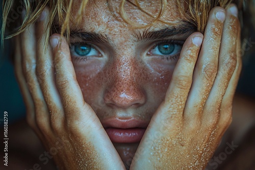 © Юлія Ткачук, Fototapeta premium man's face covered with hands, sadness, pain