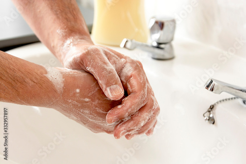 Fototapeta premium Man's hand wash his hands over sink in bathroom.