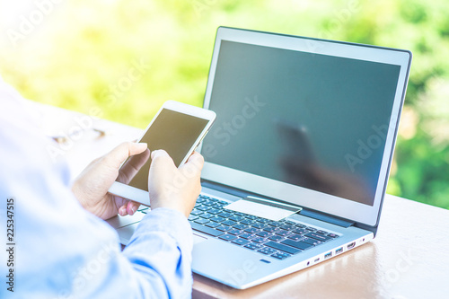 © Loveischiangrai, Fototapeta premium Man's hands holding a credit card and using laptop for online shopping.