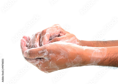 © chaiwat, Fototapeta premium man's hands in soapsuds, isolated on white