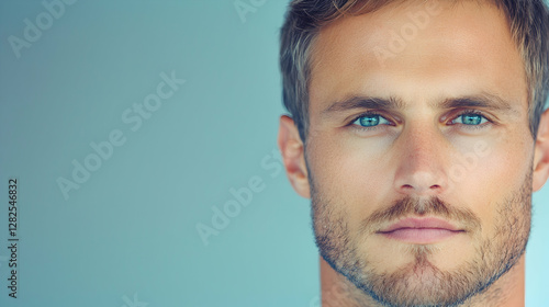 Fototapeta premium Man's portrait, serious expression, blue eyes, simple background, ideal for...