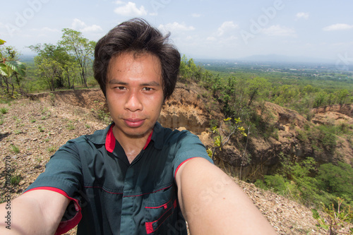 Naklejka premium Man Selfie with Doi Tok grand canyon in Mae Wang national park,
