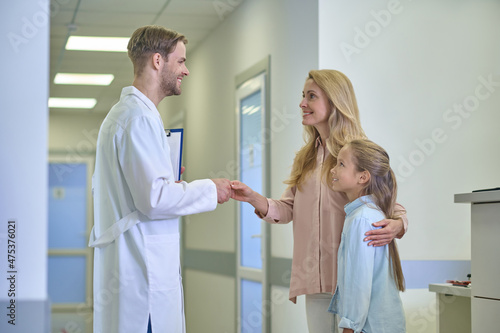 © zinkevych, Obraz premium Man shaking hands with woman hugging daughter