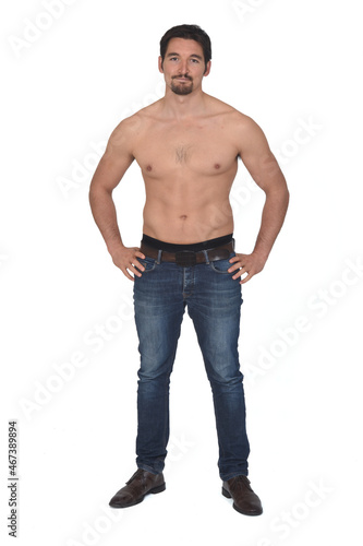 © Curto, Fototapeta premium man shirtless and with blue jeans, hands on hip and looking at camera on white background