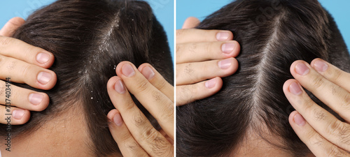 Fototapeta premium Man showing hair before and after dandruff treatment on light blue...