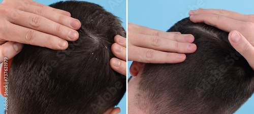 Fototapeta premium Man showing hair before and after dandruff treatment on light blue background, collage