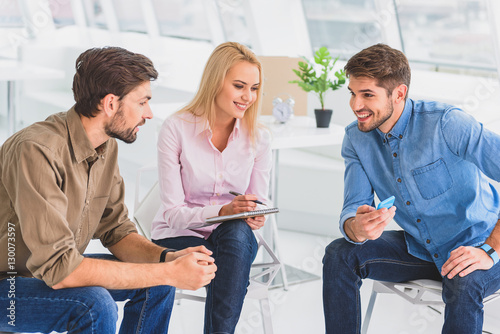© Yakobchuk Olena, Obraz premium Man showing something at telephone to others