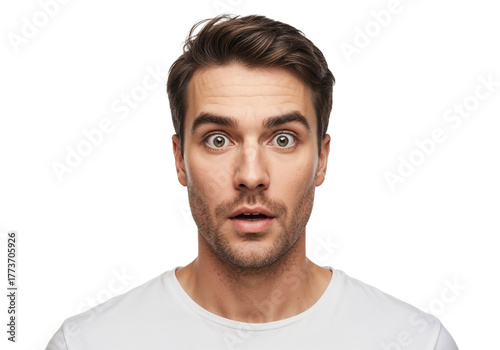 © MrBaks, Fototapeta premium Man shows surprise with wide eyes and open mouth, wearing a plain white t-shirt against a plain background