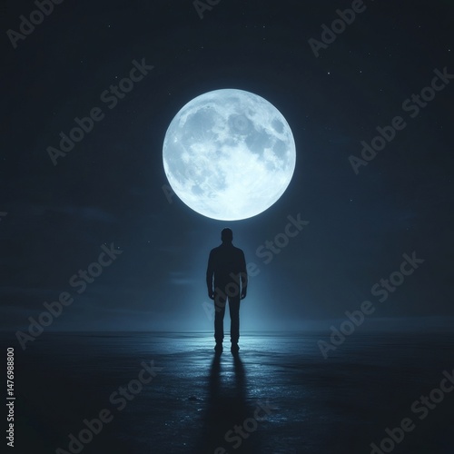 Fototapeta premium Man silhouette contemplates large moon under starry night sky, fostering...