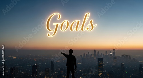 © Ning, Fototapeta premium Man Silhouette Pointing at Glowing 'Goals' Above Cityscape at Dusk