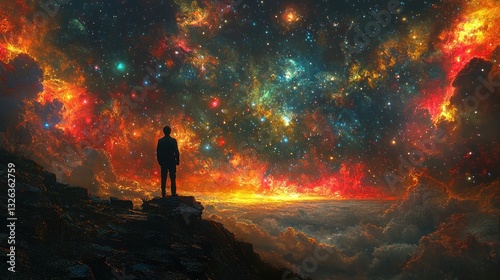 © harryaishi, Fototapeta premium Man silhouetted against vibrant nebula and starry night sky.