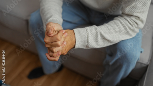 Fototapeta premium Man sitting indoors with hands clasped in a home setting, wearing a sweater and jeans, showing a close-up relaxed posture on a sofa in a modern living room.