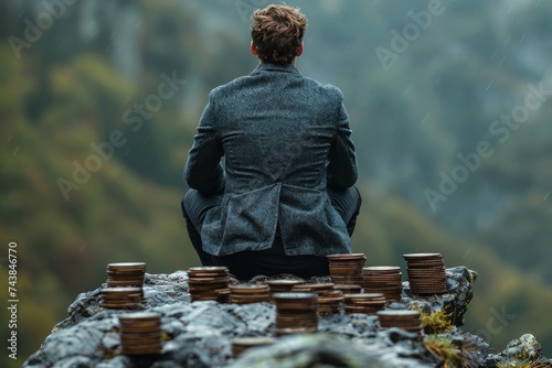 © jiawei, Fototapeta premium Man Sitting on Top of Rock by Stacks of Coins