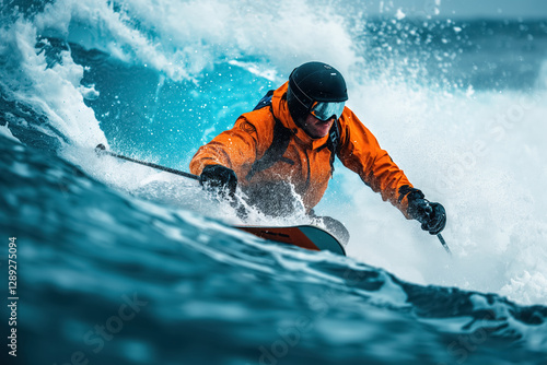 © RISHAD, Naklejka premium Man skiing in rough waters wearing orange jacket and helmet