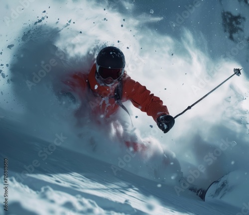 © Irena, Naklejka premium Man skis down slopes falling in powder stock. Enjoying skiing. Generative AI