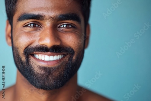 © El Media, Fototapeta premium Man Smiling Portrait Close-up with Beard Against Light Blue Background