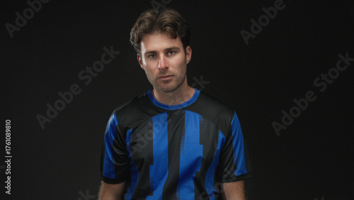 © Krakenimages.com, Naklejka premium Man smiling with slight head tilt wearing blue and black soccer jersey in studio against black backdrop; confidence.