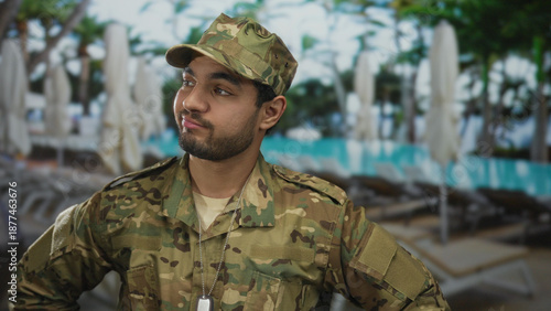 Fototapeta premium Man smirks with arms on hips by pool; confidence.