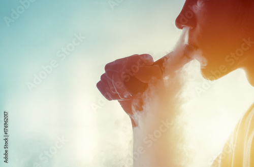 Fototapeta premium Man smoke an electronic cigarette mechanical mod on the light background