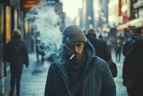 © Muhammadali, Obraz premium Man smokes, winter city street, blurry background.