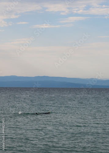 © Tatiana, Obraz premium Man snorkeling and spearfishing at sea