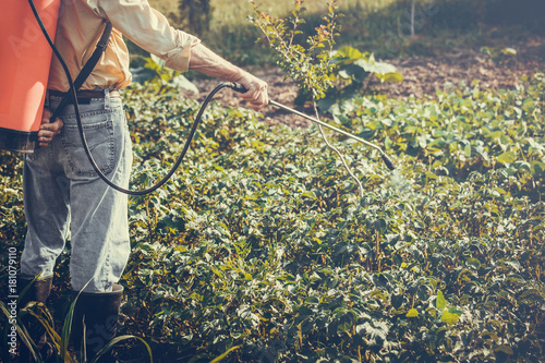 © Jovica Varga, Naklejka premium Man spraying of pesticide on potato plantation