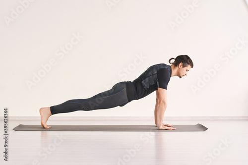 © elenavolf, Naklejka premium Man stand at plank. Home sport static training. Social distancing quarantine lifestyle. Health pushup. Person yoga asana. Ashtanga pose. Muscle stretching. Morning fitness effort
