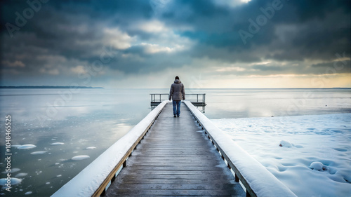 Obraz premium Man Standing Alone on Snowy Pier Over Frozen Lake