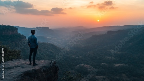 © Pichkan, Obraz premium Man Standing at Cliff Edge Watching Scenic Landscape at Sunset