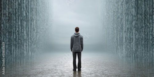 © Andrii , Obraz premium Man Standing Before a Digital Wall of Binary Code