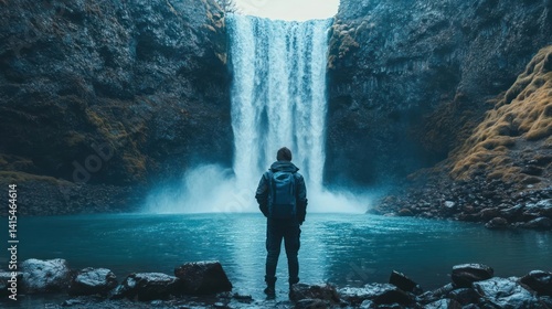 © RobertShuk, Obraz premium Man standing before powerful waterfall